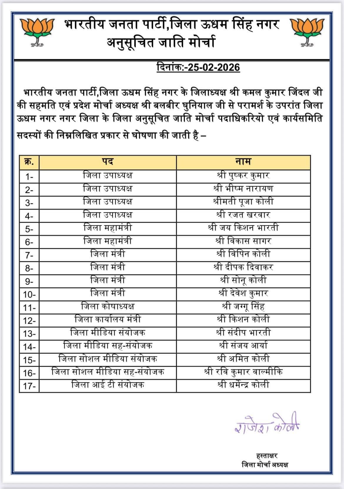 - ऊधम सिंह नगर में भाजपा का संगठनात्मक बिगुल, चारों मोर्चों की नई टीम घोषित