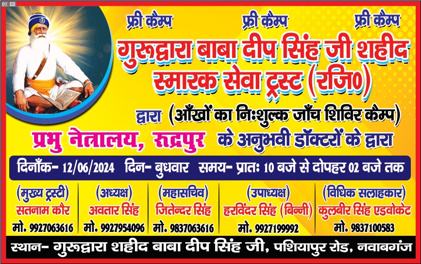 Punjabisachvani:- अगर आप भी आंखों की किसी भी समस्या से परेशान और अपने आंखों की जांच कराने में असमर्थ हैं तो आपके लिए अच्छी खबर है, बता दें की गुरूद्वारा शहीद बाबा दीप सिंह जी, पशियापुर रोड, नवाबगंज में गुरुद्वारा बाबा दीप सिंह जी शहीद स्मारक सेवा ट्रस्ट (रजि०) द्वारा 12 जून को एक निशुल्क नेत्र जांच शिविर कैंप का आयोजन किया गया है, जिसमे आप अपनी जांच बिलकुल फ्री करा सकते हैं।