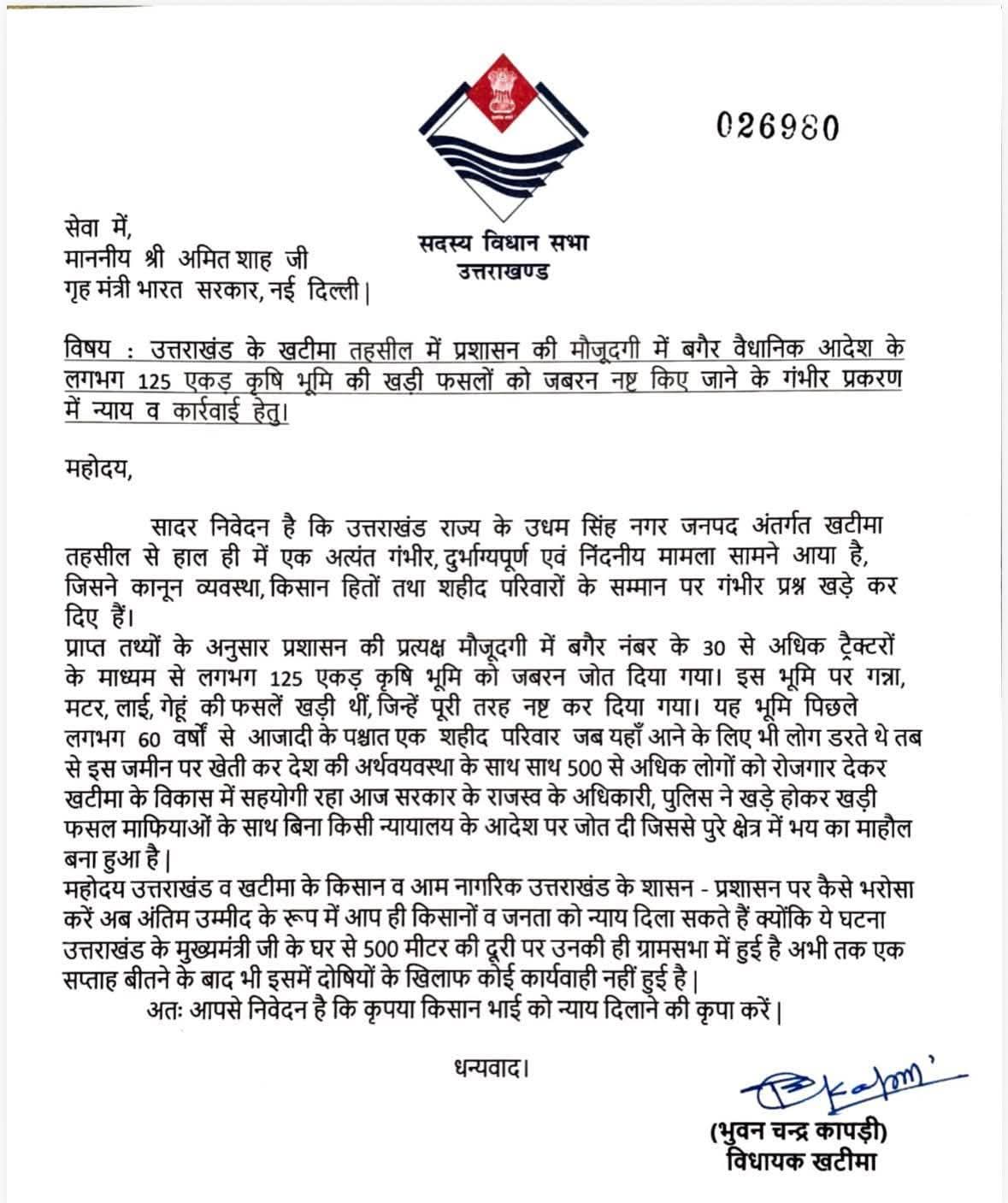 खटीमा। उत्तराखंड के उधम सिंह नगर जनपद अंतर्गत खटीमा तहसील में प्रशासन की कथित मनमानी का गंभीर मामला सामने आया है। खटीमा विधायक भुवन चंद्र कापड़ी ने इस संबंध में केंद्रीय गृह मंत्री अमित शाह को पत्र लिखकर लगभग 125 एकड़ कृषि भूमि पर खड़ी फसलों को जबरन नष्ट किए जाने का आरोप लगाया है और न्याय व कार्रवाई की मांग की है।