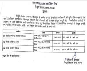 रुद्रपुर। विद्युत विभाग ने शहर के लोगों को एक बड़ी चेतावनी दी है। विद्युत विभाग द्वारा जारी सूचना के अनुसार रुद्रपुर, किच्छा व पंतनगर सिडकुल के विद्युत उपकेंद्र की आपूर्ति बाधित रहेगी। जारी सूचना के अनुसार 24 अक्टूबर को पंतनगर, 25 अक्टूबर को रुद्रपुर व 26 अक्टूबर को किच्छा में सुबह 9 बजे से 5 बजे तक बिजली गुल रहेगी।