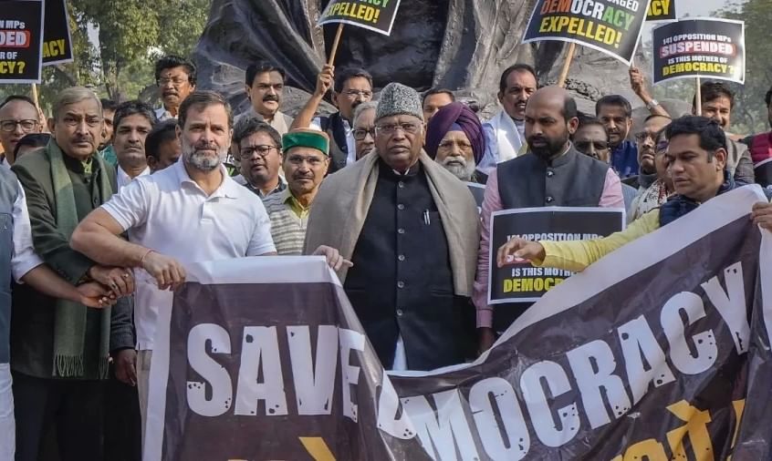 कांग्रेस सांसद शशि थरूर भी विरोध प्रदर्शन में पहुंचे हैं. उन्होंने कहा कि संसदीय लोकतंत्र पर हमला हो रहा है, जो कि बेहद गंभीर है. रैली का उद्देश्य जनता का लोकतंत्र के सामने मौजूद खतरनाक स्थिति की ओर ध्यान खींचना है. इतिहास में कभी भी 146 सांसदों को निलंबित नहीं किया गया है. बकौल थरूर यह लोकतंत्र पर एक धब्बा है. उन्होंने कहा कि यह हमारे देश के लिए एक राष्ट्रीय अपमान है जो खुद को लोकतंत्र की जननी कहता है।